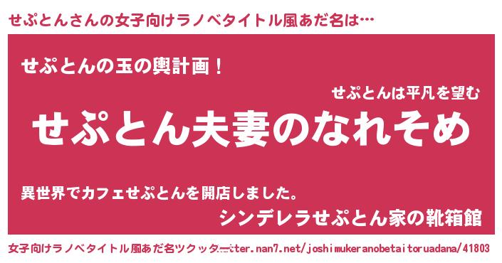 | 男性向けラノベタイトル風あだ名 | 『おまえをオタクにしてやるから、俺をせぷとんにしてくれ! 』 |