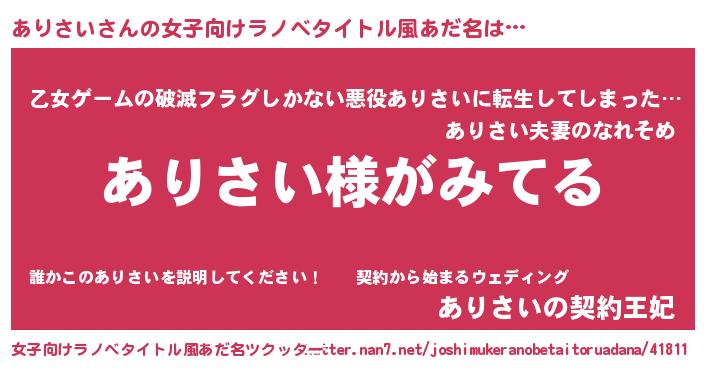 | 男性向けラノベタイトル風あだ名 | 『ありさいの嫁は女の子じゃないと思った?』 |