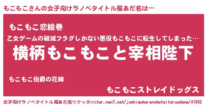 | 男性向けラノベタイトル風あだ名 | 『もこもこに滅ぼされるだけの簡単なお仕事です』 |