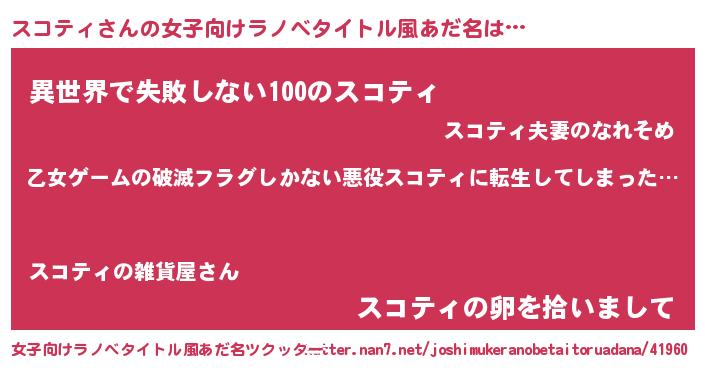 | 男性向けラノベタイトル風あだ名 | 『この素晴らしい世界にスコティを!』 |
