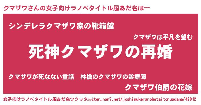 | 男性向けラノベタイトル風あだ名 | 『ノーゲーム・ノークマザワ』 |