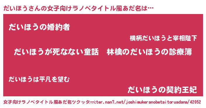 | 男性向けラノベタイトル風あだ名 | 『魔弾の王とだいほう』 |