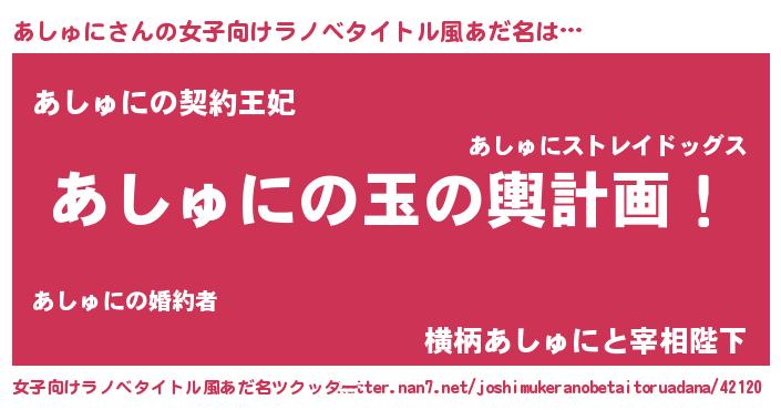 | 意味不明あだ名 | 『ヨモギ科あしゅに属』『自称あしゅに』 |
