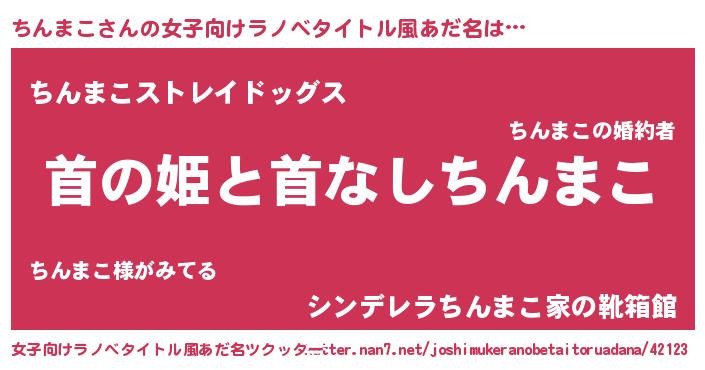 ちんまこさんの女子向けラノベタイトル風あだ名は… 『首の姫と首なしちんまこ』『ちんまこストレイドッグス』『シンデレラちんまこ家の靴箱館』 ツクッター #女子向けラノベタイトル風あだ名ツクッター http://tkutter.nan7.net/joshimukeranobetaitoruadana/42123/