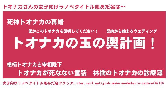 | 男性向けラノベタイトル風あだ名 | 『転生したらトオナカだった件』 |