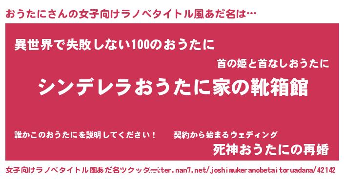 おうたにさんの女子向けラノベタイトル風あだ名は… 『シンデレラおうたに家の靴箱館』『異世界で失敗しない100のおうたに』『死神おうたにの再婚』 ツクッター #女子向けラノベタイトル風あだ名ツクッター http://tkutter.nan7.net/joshimukeranobetaitoruadana/42142/