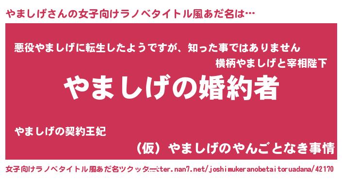 | 男性向けラノベタイトル風あだ名 | 『うちの娘の為ならば、俺はもしかしたらやましげも倒せるかもしれない。』 |