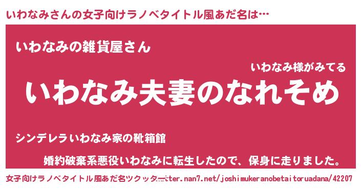 | 男性向けラノベタイトル風あだ名 | 『おまえをオタクにしてやるから、俺をいわなみにしてくれ! 』 |