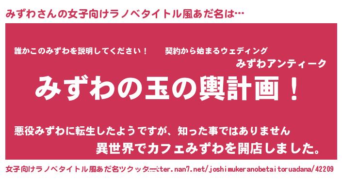 | 男性向けラノベタイトル風あだ名 | 『みずわ~年齢イコール彼女いない歴の魔法使い~』 |