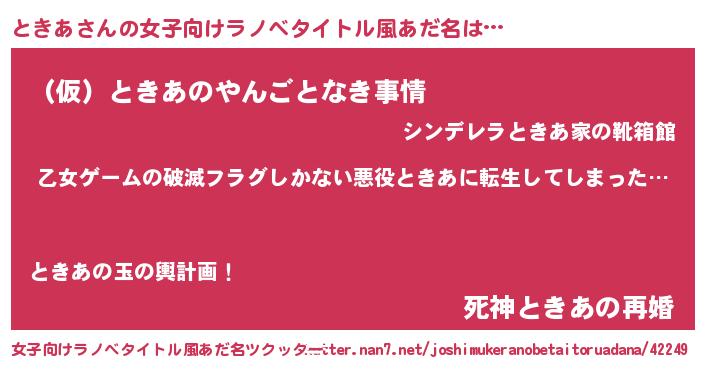 | 男性向けラノベタイトル風あだ名 | 『この素晴らしい世界にときあを!』 |