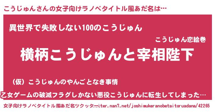 | 男性向けラノベタイトル風あだ名 | 『こうじゅんに滅ぼされるだけの簡単なお仕事です』 |