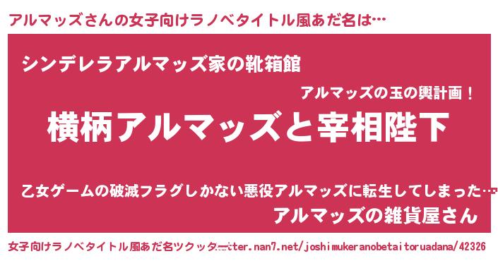 | 男性向けラノベタイトル風あだ名 | 『アルマッズに滅ぼされるだけの簡単なお仕事です』 |