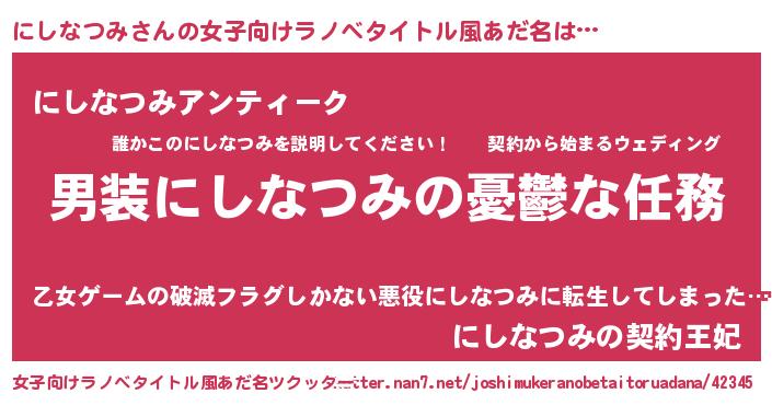 | 意味不明あだ名 | 『自称にしなつみ』『永久保存にしなつみ』 |
