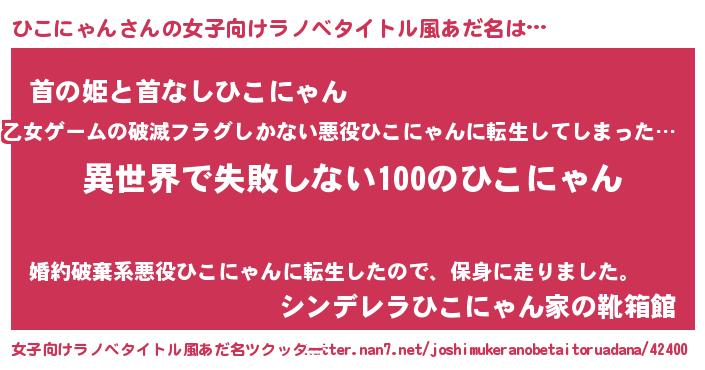 | 男性向けラノベタイトル風あだ名 | 『ひこにゃんという概念が存在しない退屈な世界 』 |