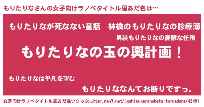 | 男性向けラノベタイトル風あだ名 | 『もりたりな~年齢イコール彼女いない歴の魔法使い~』 |