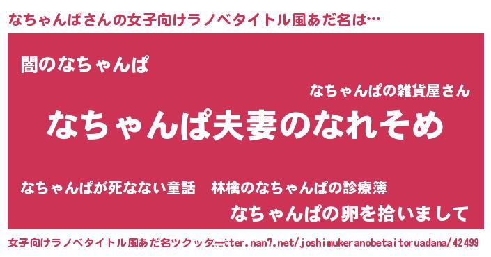 | 男性向けラノベタイトル風あだ名 | 『おまえをオタクにしてやるから、俺をなちゃんぱにしてくれ! 』 |