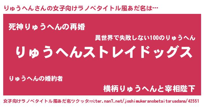 | 男性向けラノベタイトル風あだ名 | 『Re:りゅうへんから始める異世界生活』 |