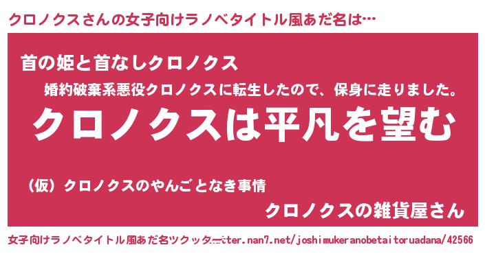 クロノクスさんの女子向けラノベタイトル風あだ名は… 『クロノクスは平凡を望む』『首の姫と首なしクロノクス』『クロノクスの雑貨屋さん』 ツクッター #女子向けラノベタイトル風あだ名ツクッター http://tkutter.nan7.net/joshimukeranobetaitoruadana/42566/