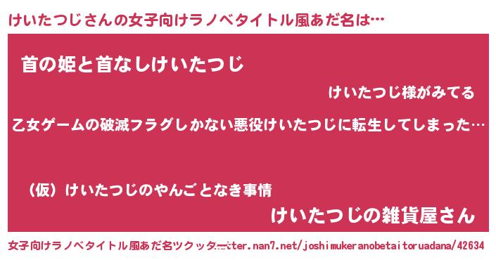 | 男性向けラノベタイトル風あだ名 | 『この素晴らしい世界にけいたつじを!』 |