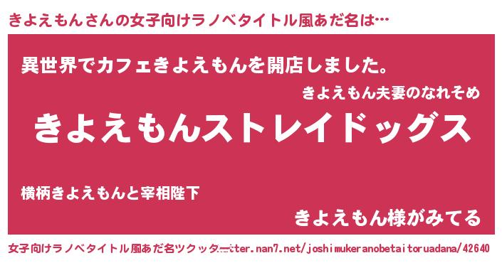 | 男性向けラノベタイトル風あだ名 | 『Re:きよえもんから始める異世界生活』 |