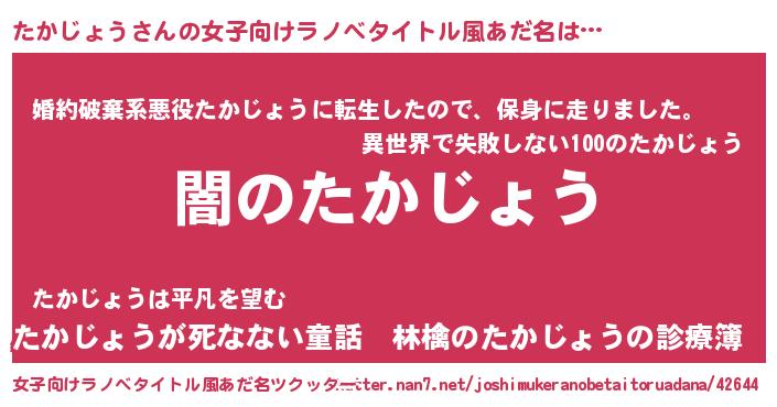 | 男性向けラノベタイトル風あだ名 | 『Re:たかじょうから始める異世界生活』 |