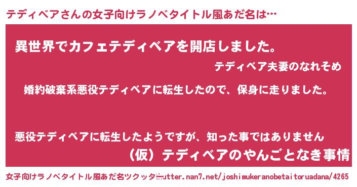 | 男性向けラノベタイトル風あだ名 | 『転生したらテディベアだった件』 |