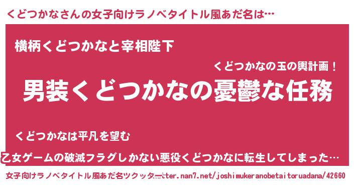 | 男性向けラノベタイトル風あだ名 | 『うちのくどつかなが世界を掌握している!』 |