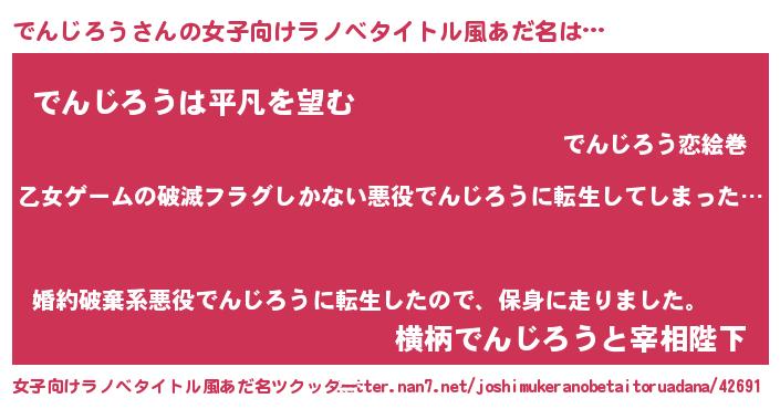 | 男性向けラノベタイトル風あだ名 | 『この素晴らしい世界にでんじろうを!』 |