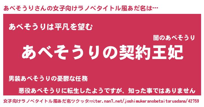 | 男性向けラノベタイトル風あだ名 | 『あべそうりという概念が存在しない退屈な世界 』 |