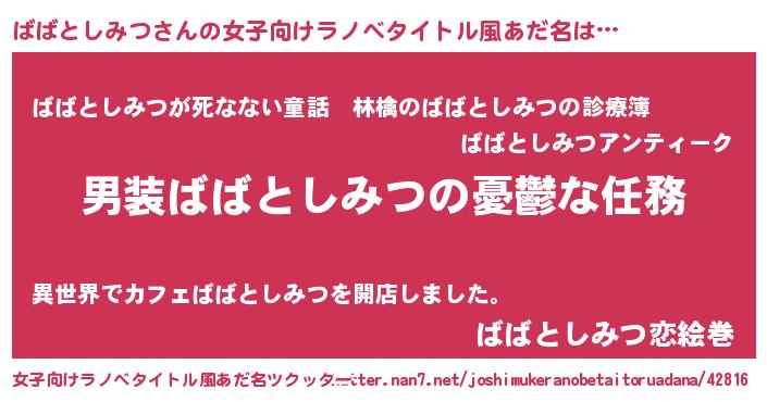 | 男性向けラノベタイトル風あだ名 | 『うちのばばとしみつが世界を掌握している!』 |