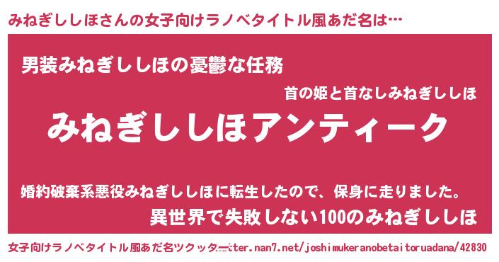 | 胡散臭い通販商品みたいなあだ名 | 『テレビで話題の高麗人参…その名も「みねぎししほ」』 |