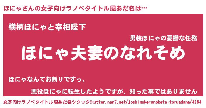 | 男性向けラノベタイトル風あだ名 | 『おまえをオタクにしてやるから、俺をほにゃにしてくれ! 』 |