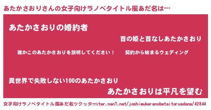 | 男性向けラノベタイトル風あだ名 | 『アタカサオリアートオンライン』 |