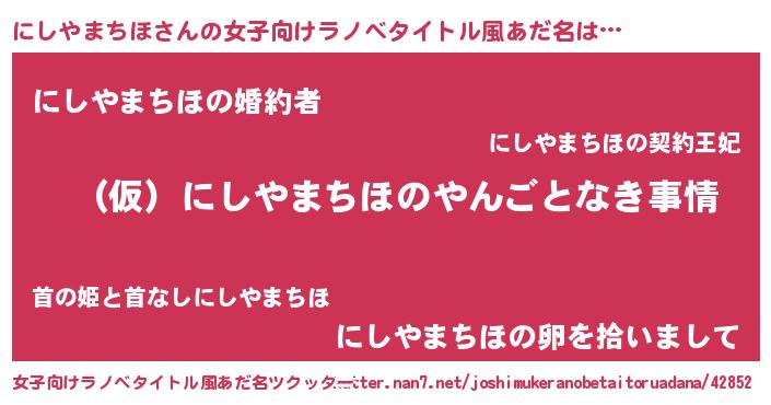 | 男性向けラノベタイトル風あだ名 | 『にしやまちほの憂鬱』 |