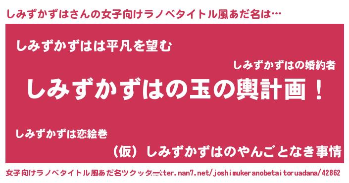 | 男性向けラノベタイトル風あだ名 | 『しみずかずは~年齢イコール彼女いない歴の魔法使い~』 |