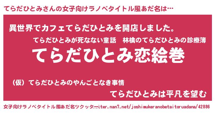 | 男性向けラノベタイトル風あだ名 | 『おまえをオタクにしてやるから、俺をてらだひとみにしてくれ! 』 |
