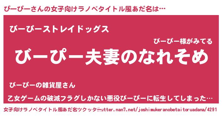 | 男性向けラノベタイトル風あだ名 | 『おまえをオタクにしてやるから、俺をびーぴーにしてくれ! 』 |