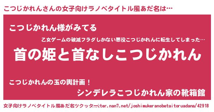 こつじかれんさんの女子向けラノベタイトル風あだ名は… 『首の姫と首なしこつじかれん』『こつじかれん様がみてる』『シンデレラこつじかれん家の靴箱館』 ツクッター #女子向けラノベタイトル風あだ名ツクッター http://tkutter.nan7.net/joshimukeranobetaitoruadana/42918/