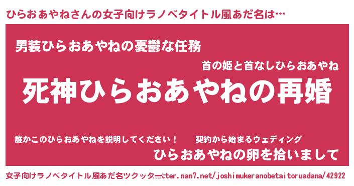 | 男性向けラノベタイトル風あだ名 | 『ノーゲーム・ノーヒラオアヤネ』 |