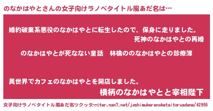 | 男性向けラノベタイトル風あだ名 | 『魔弾の王とのなかはやと』 |