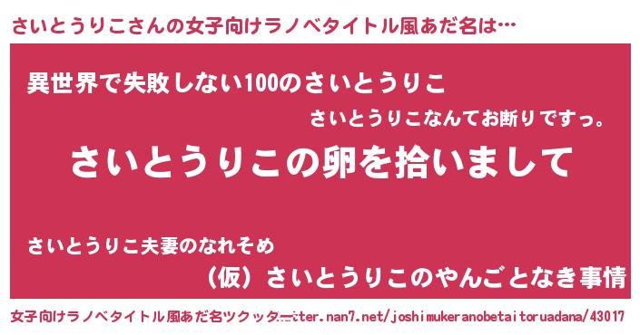 | 男性向けラノベタイトル風あだ名 | 『ダンジョンにさいとうりこを求めるのは間違っているだろうか』 |