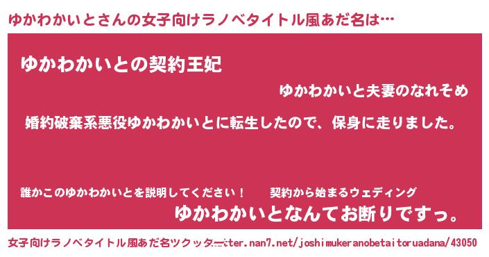 ゆかわかいとさんの女子向けラノベタイトル風あだ名は… 『婚約破棄系悪役ゆかわかいとに転生したので、保身に走りました。』『ゆかわかいとの契約王妃』『ゆかわかいとなんてお断りですっ。』 ツクッター #女子向けラノベタイトル風あだ名ツクッター http://tkutter.nan7.net/joshimukeranobetaitoruadana/43050/