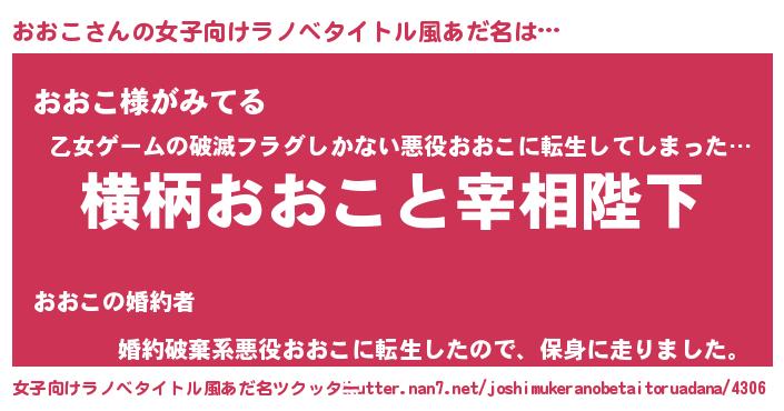| 男性向けラノベタイトル風あだ名 | 『おおこに滅ぼされるだけの簡単なお仕事です』 |