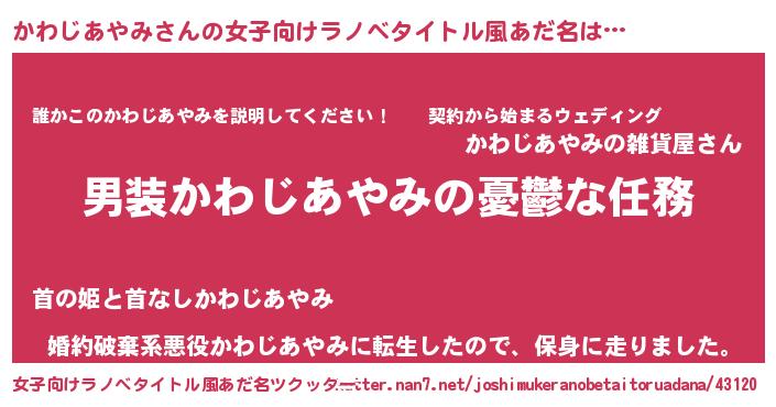 | 男性向けラノベタイトル風あだ名 | 『うちのかわじあやみが世界を掌握している!』 |