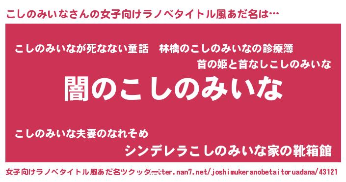 | 男性向けラノベタイトル風あだ名 | 『Re:こしのみいなから始める異世界生活』 |