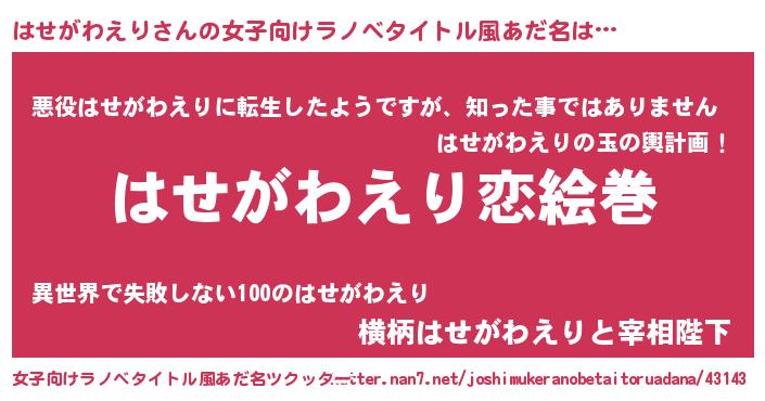 | 男性向けラノベタイトル風あだ名 | 『ノーゲーム・ノーハセガワエリ』 |