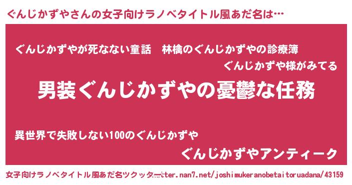 | 男性向けラノベタイトル風あだ名 | 『うちのぐんじかずやが世界を掌握している!』 |