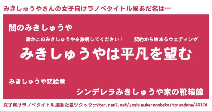 | 男性向けラノベタイトル風あだ名 | 『ダンジョンにみきしゅうやを求めるのは間違っているだろうか』 |