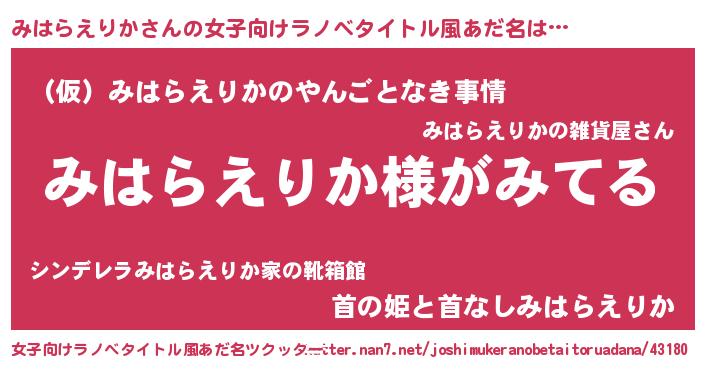 | 男性向けラノベタイトル風あだ名 | 『みはらえりかの嫁は女の子じゃないと思った?』 |