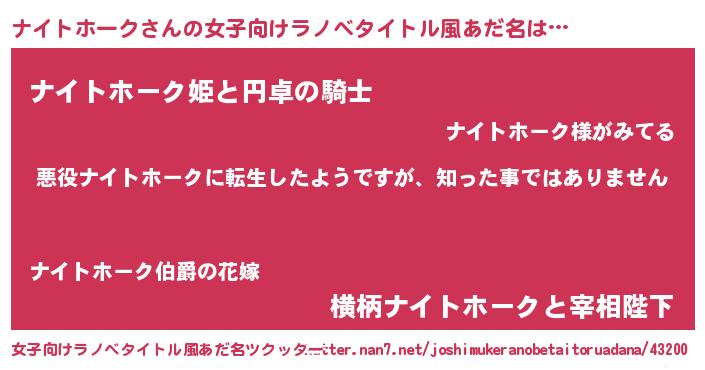 | 男性向けラノベタイトル風あだ名 | 『この素晴らしい世界にナイトホークを!』 |